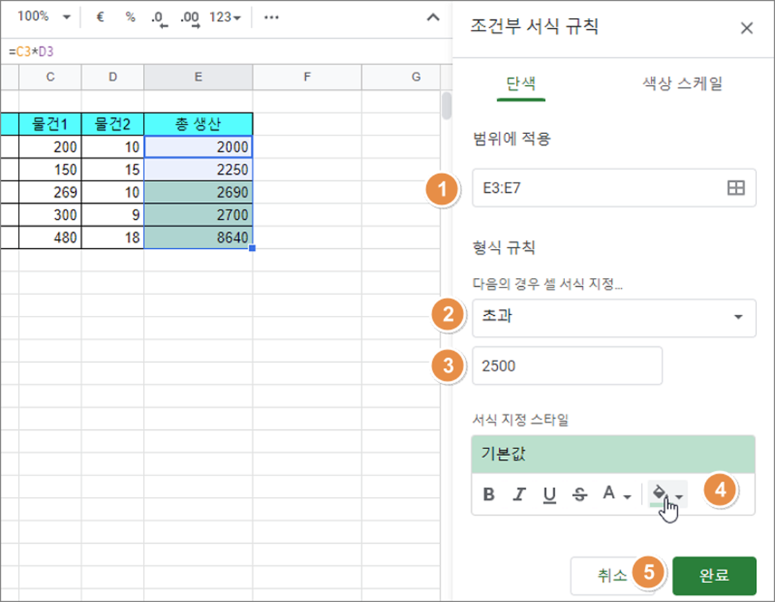 ▼ 그림처럼 번호 순서대로 조건부 서식을 적용하기 위해 설정을 진행합니다. E3:E7 범위에 2500 을 초과할 경우 지정한 서식을 적용할 조건부 서식입니다. 화면 하단에 완료 버튼을 눌러 조건부 서식을 적용합니다.
