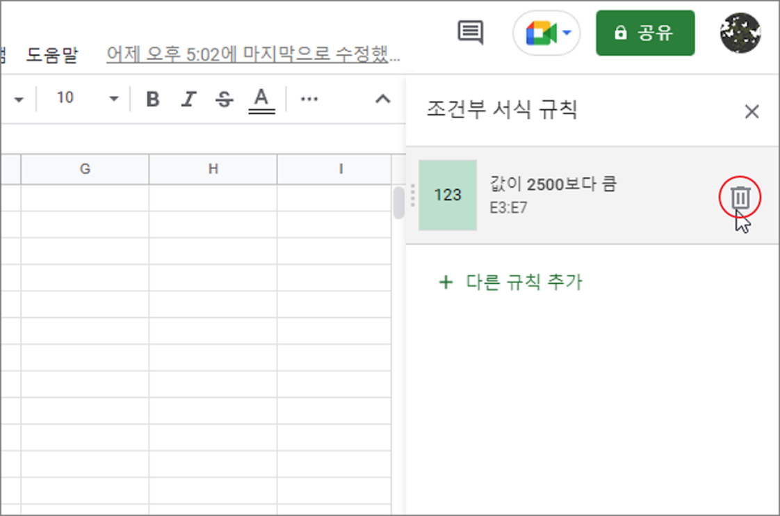 ▼ 오른쪽 사이드에 조건부 서식 규칙 설정창이 뜨면 상단에 선택한 셀에 적용된 규칙이 나타날 겁니다. 오른쪽에 휴지통 버튼을 눌러 삭제합니다.