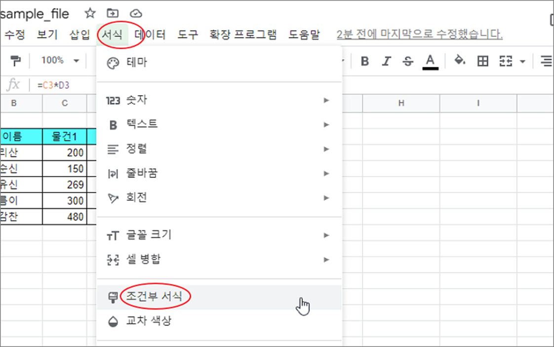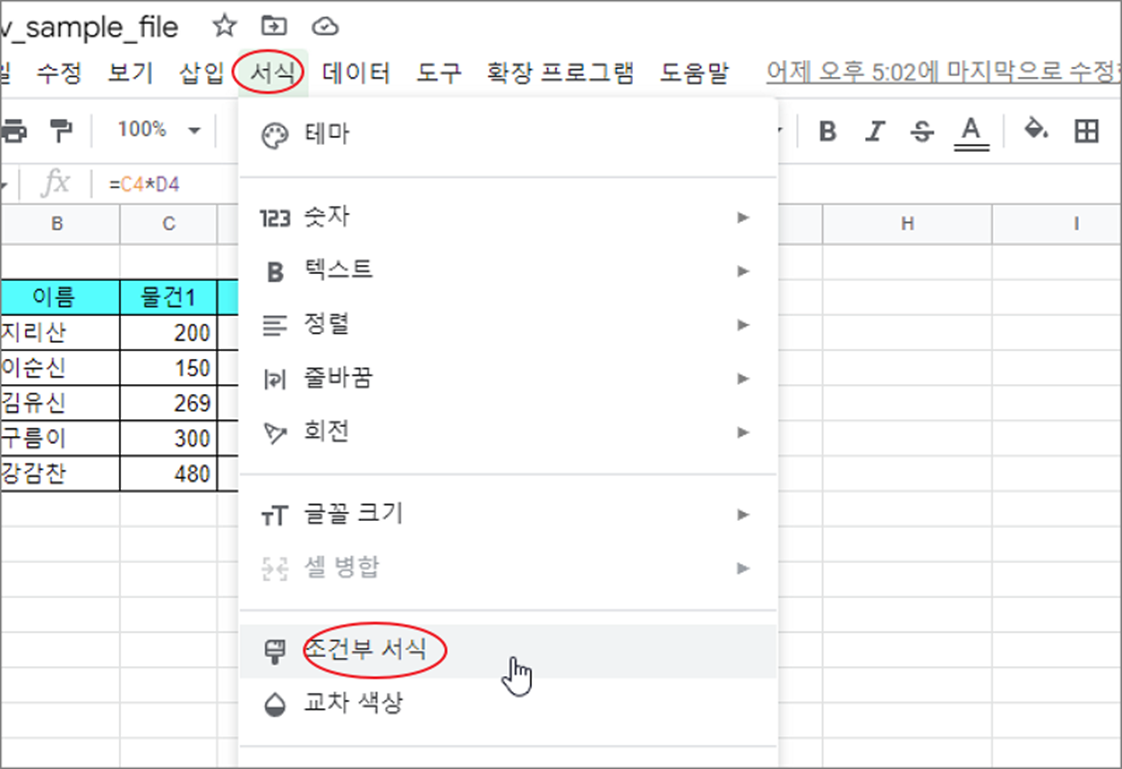 ▼ 상단 메뉴 서식 > 조건부 서식 메뉴를 선택합니다.