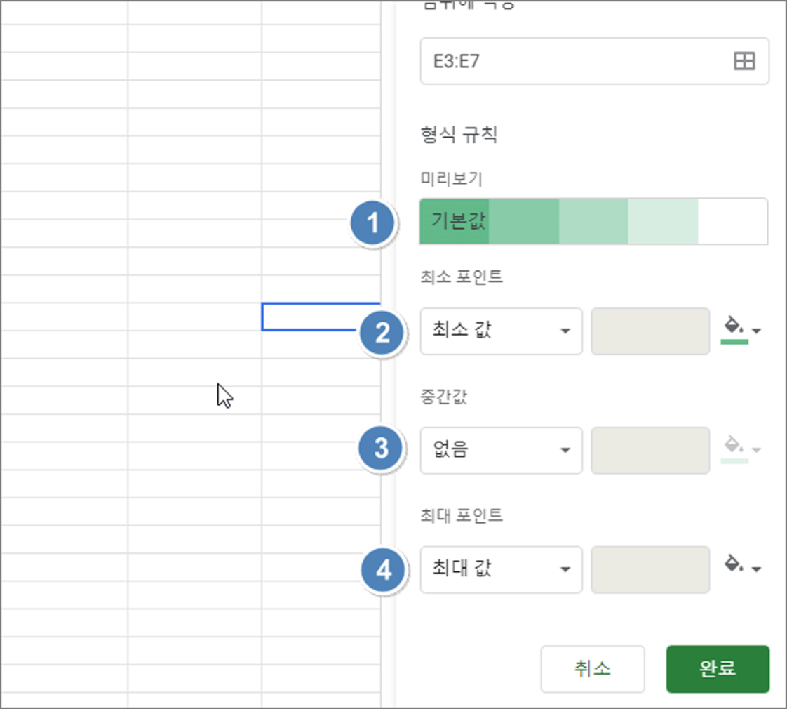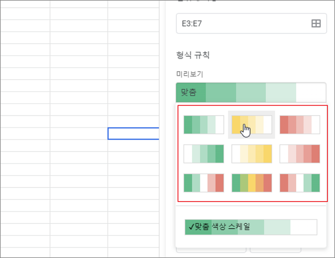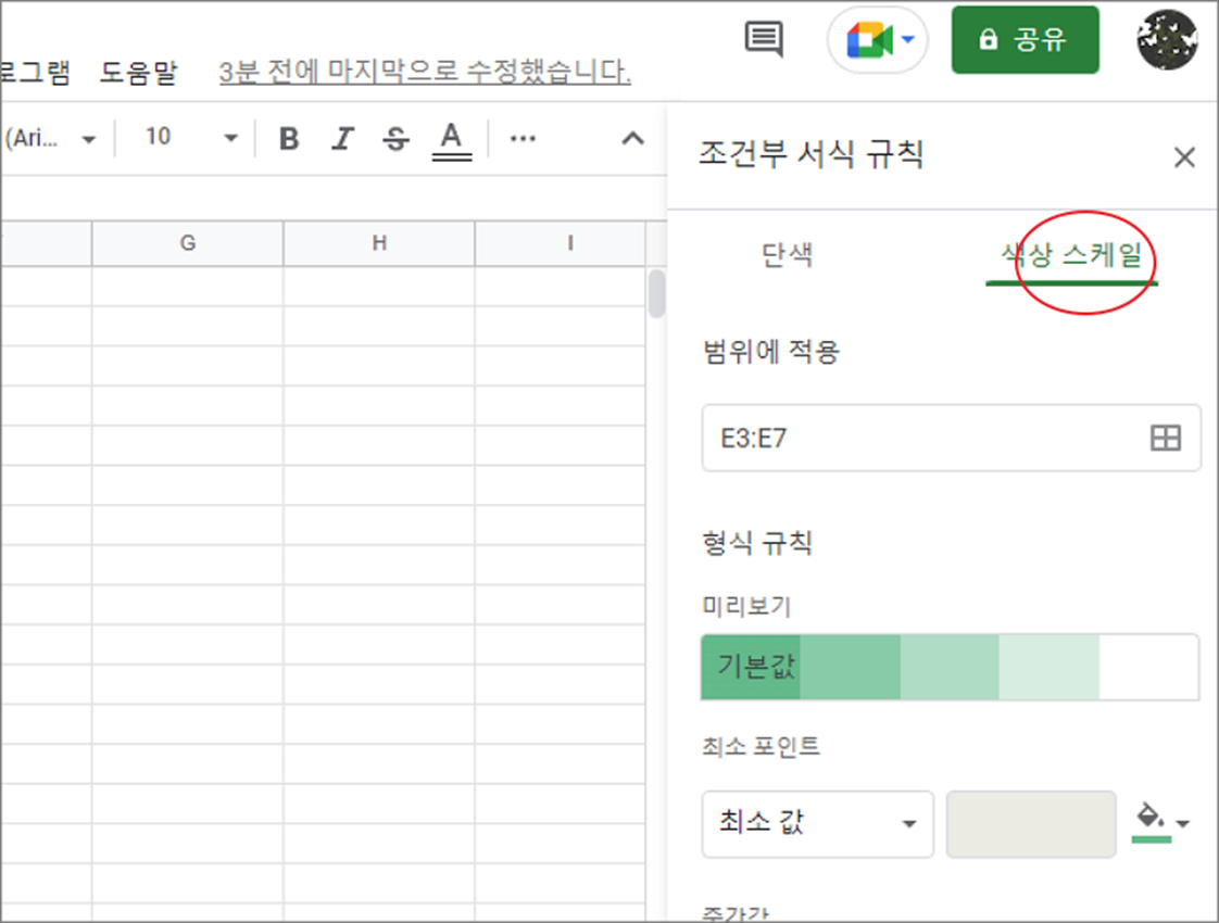 ▼ 오른쪽 화면에 뜬 조건부 서식 규칙 팝업창에서 색상 스케일 탭으로 이동합니다. 단색이 아닌 그라데이션을 적용할 수 있습니다.