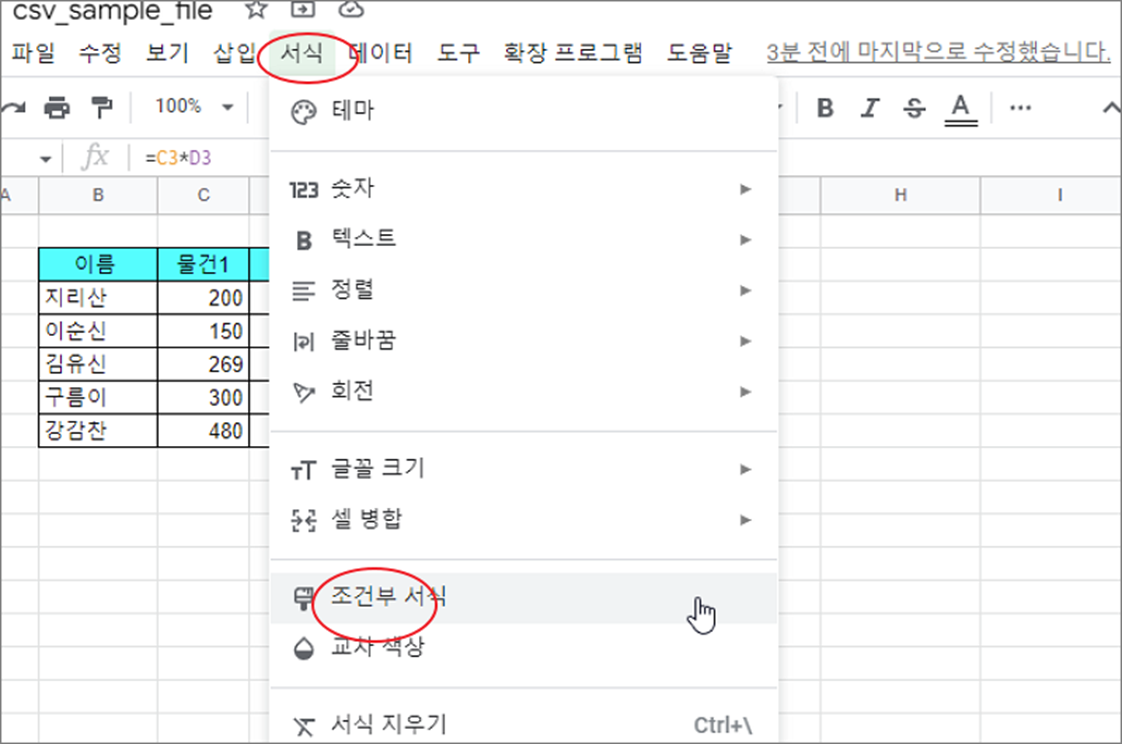 ▼ 조건부 서식 적용을 위해 상단 메뉴 서식 > 조건부 서식 으로 갑니다.