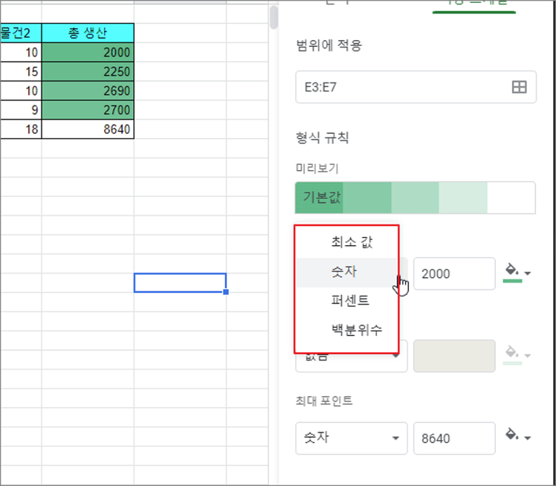 ▼ 바로 아래 최소값 설정에서 입력하고 싶은 숫자의 종류에 따라 숫자, 퍼센트, 백분위수 중 하나를 선택할 수 있습니다.