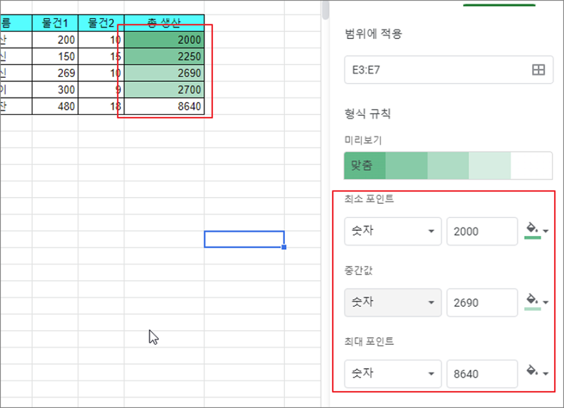 ▼ 다음으로 중간값과 최대값을 지정해서 값의 변경에 따른 색상 변화를 적용할 수 있습니다.