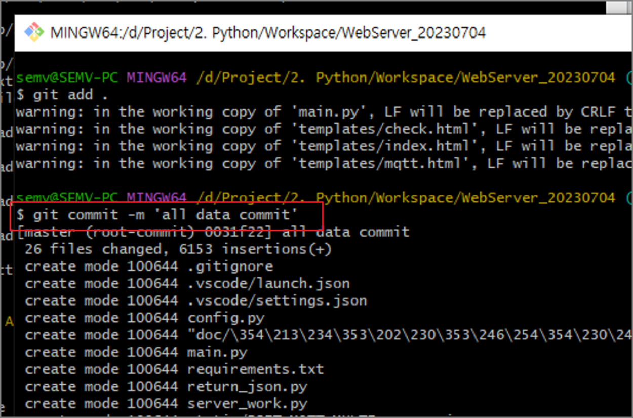 ▼ 다음은 스테이징에 추가한 파일을 Git 저장소 히스토리에 추가하기 위한 명령어를 실행합니다. “사용자 주석” 은 현재 올리는 파일의 성격을 적은 텍스트입니다. 매번 귀찮겠지만 작업 내용을 정확하게 요약해서 입력하는 버릇을 들이시기 바랍니다.