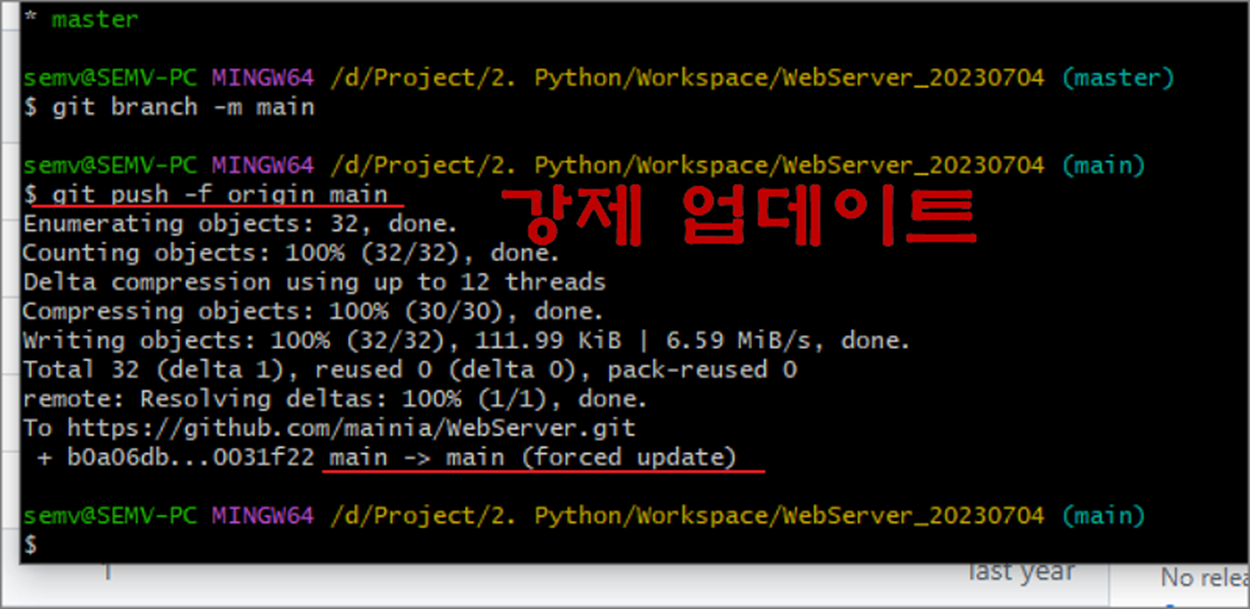 ▼ Push 명령을 이용해서 Remote 저장소인 origin 에 main branch 이름으로 전송합니다. –f 옵션은 강제 업데이트 입니다.