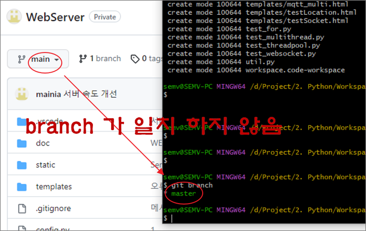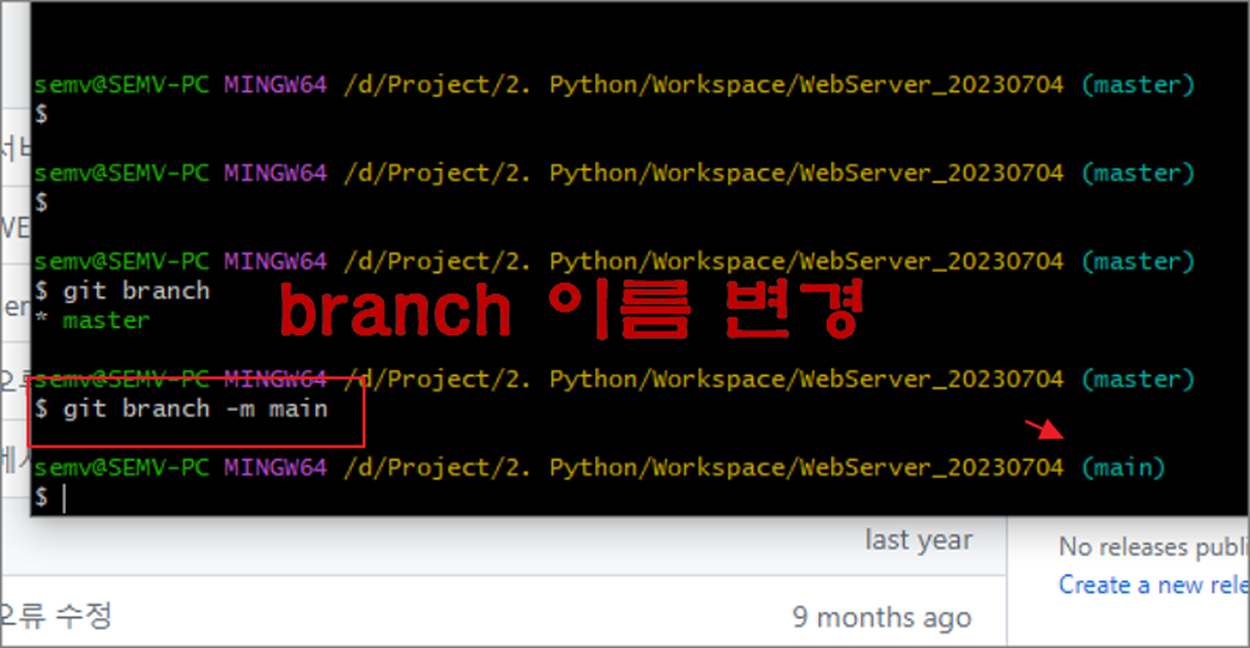 ▼ branch 명을 동일하게 바꿔서 올려 보겠습니다. Branch 이름을 아래 명령어를 이용해서 master -> main 으로 변경합니다.
