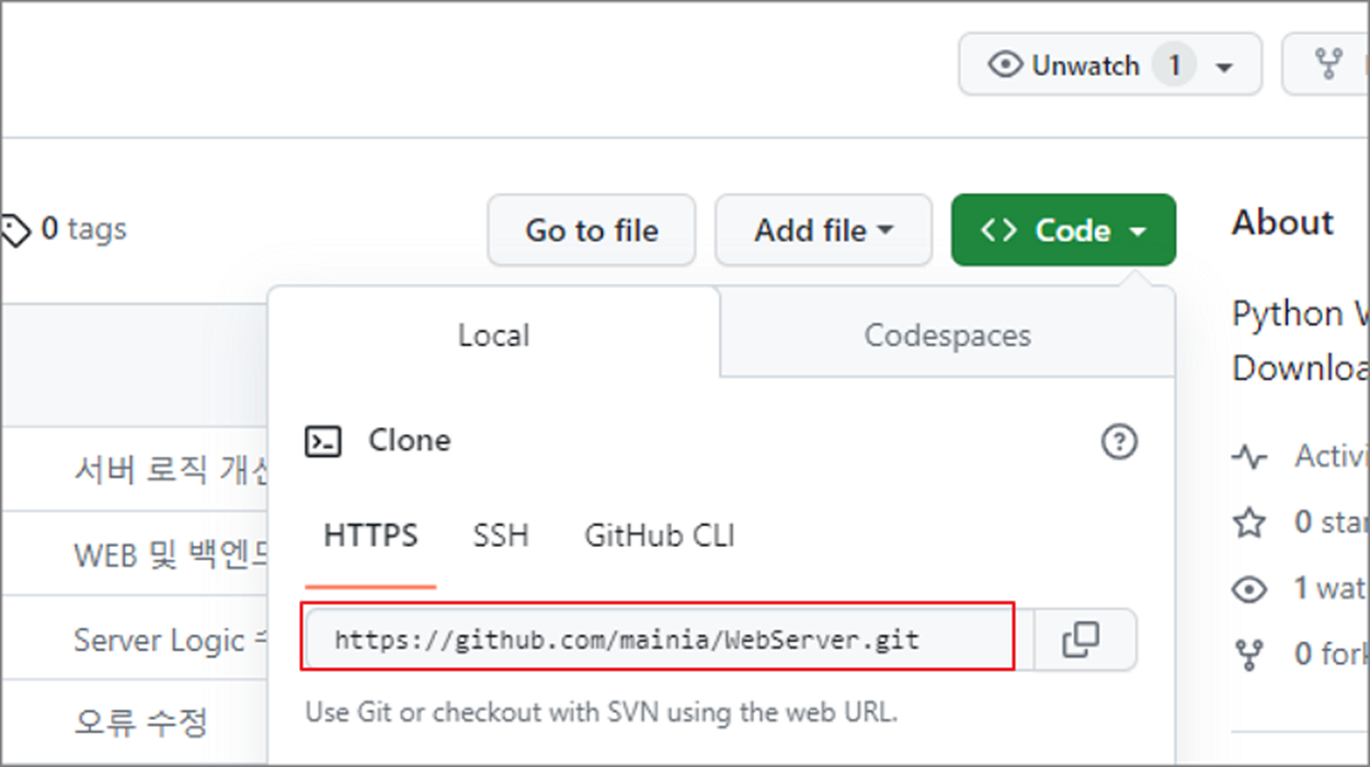 ▼ 다음은 로컬 저장소와 원격 Github 에 있는 저장소를 연결할 주소가 필요합니다. Github 에 만든 자신의 저장소 주소를 복사합니다.