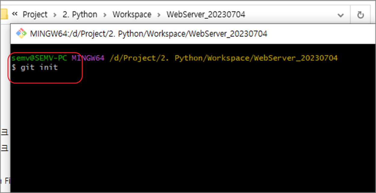 ▼ Git Bash Here 창이 실행되었다면 콘솔창에 “git init” 이라고 입력합니다. 이것은 Git 저장소를 초기화 하는 명령어입니다. Github 에 파일을 올리기 전에 해당 디렉토리를 Git 내에 저장소로 만들고 버전 관리를 시작할 수 있는 환경을 만드는 작업입니다.