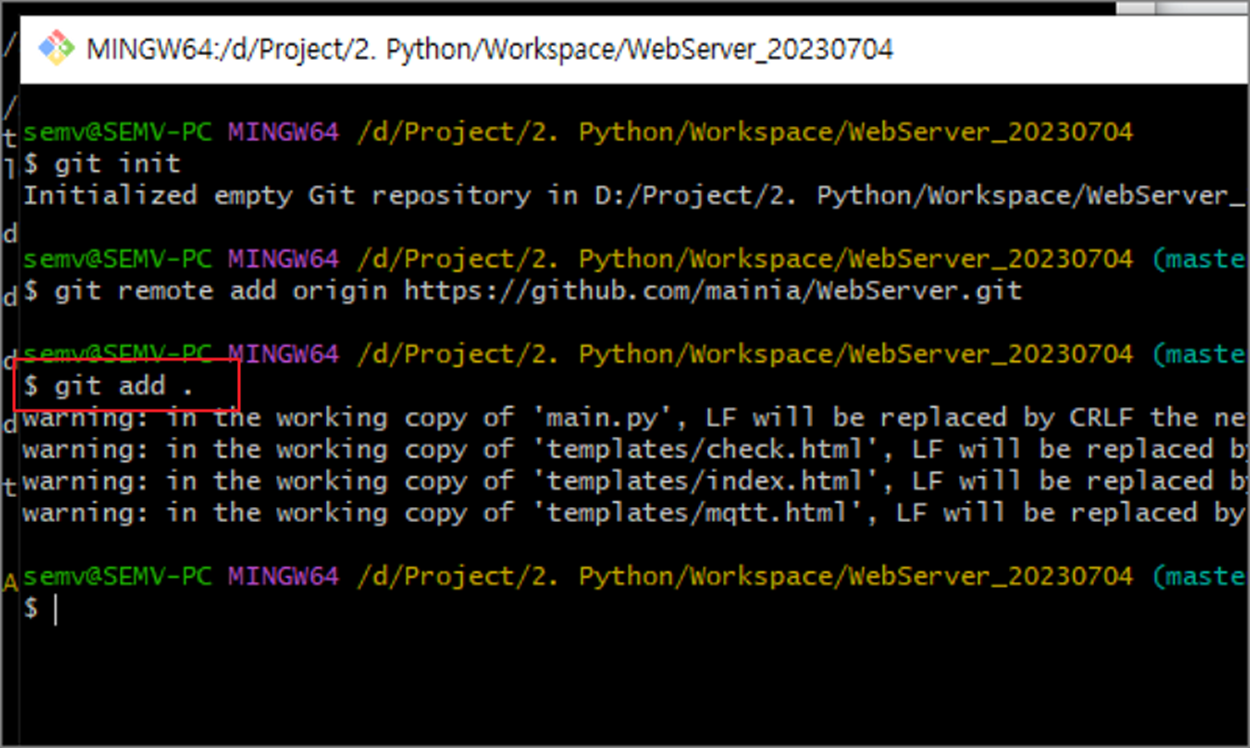 ▼ 설정이 끝났습니다. 이제 모든 파일을 자신의 Github 주소로 올려 보겠습니다. “git add 콤마” 명령어를 사용해 스테이징 영역에 변경한 파일을 추가합니다.