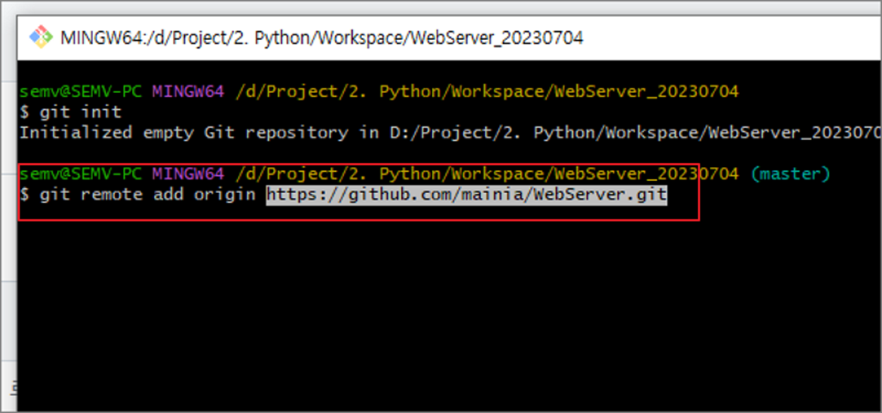 ▼ 명령어는 “git remote add origin [원격저장소 주소]” 입니다. 해당 명령어를 통해 로컬 저장소와 원격 저장소를 연결합니다. 이렇게 설정해야 파일을 Push 하거나 Pull 할 수 있습니다. 복사한 주소를 원격 branch 정보로 추가합니다. 원격 branch 이름은 origin 입니다. 주소를 기억하고 입력하기가 힘들기 때문에 별칭을 만들어서 사용하는 것입니다.