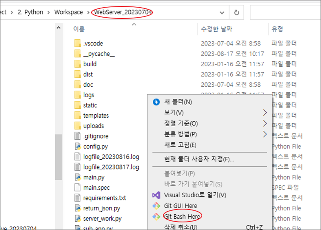 ▼ 소스를 업데이트할 폴더로 이동해서 오른쪽 마우스를 클릭합니다. 그리고 Git Bash Here 메뉴를 선택합니다. 명령을 입력할 콘솔창을 띄울 것입니다.