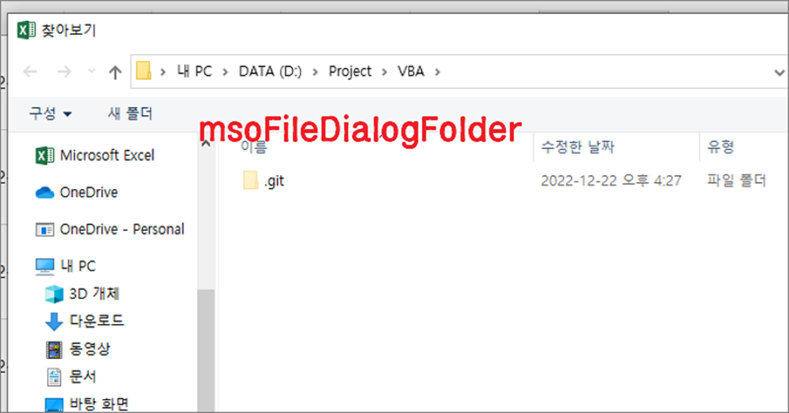 ▼ msoFileDialogFolderPicker 옵션은 파일은 화면에 나타나지 않고 폴더만 보입니다.