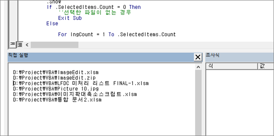| With fd .Show If .SelectedItems.Count = 0 Then ''선택한 파일이 없는 경우 Exit Sub Else Debug.Print "File Path : " & .SelectedItems(1) End If End With |
