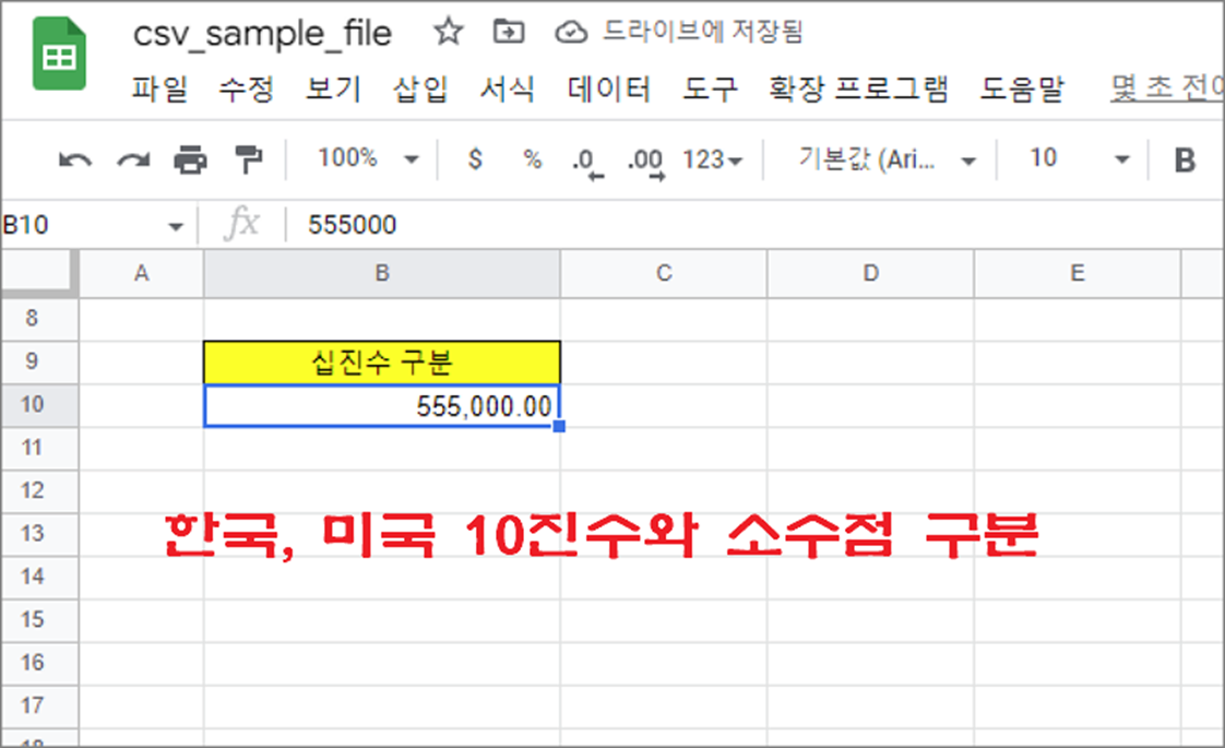 ▼ 마지막으로 10진수 구분이 언어별로 어떻게 달라지는지 알아보겠습니다. 한국과 미국은 동일하게 10진수는 “,” 쉼표로 하고 소수점은 “.” 콤마로 합니다.