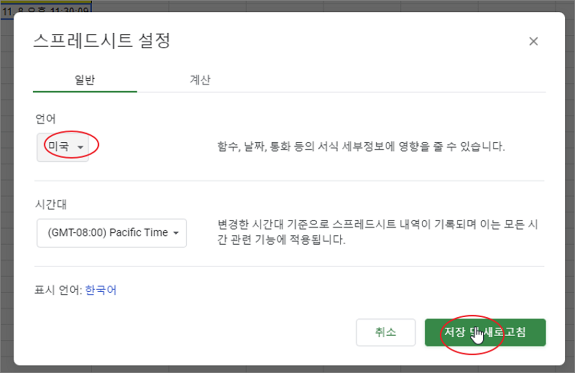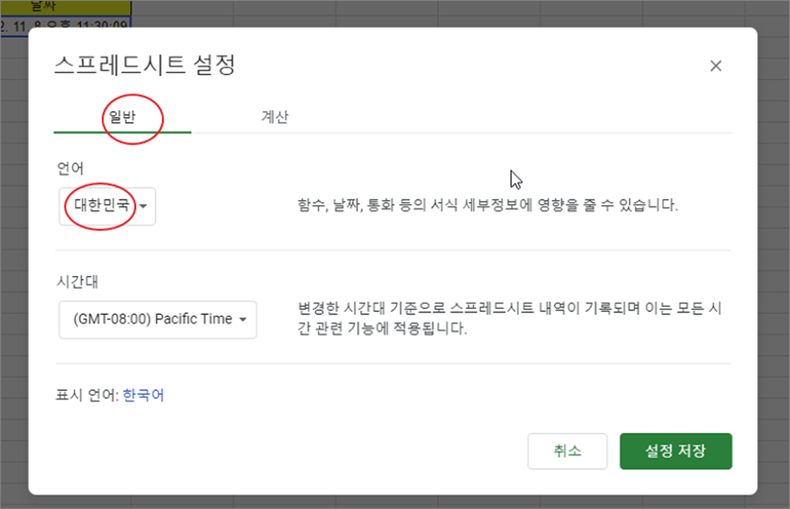 ▼ 스프레드시트 설정 창이 뜨면 일반 탭으로 이동합니다. 그리고 언어 항목으로 가서 대한민국으로 선택된 콤보 박스를 클릭합니다.