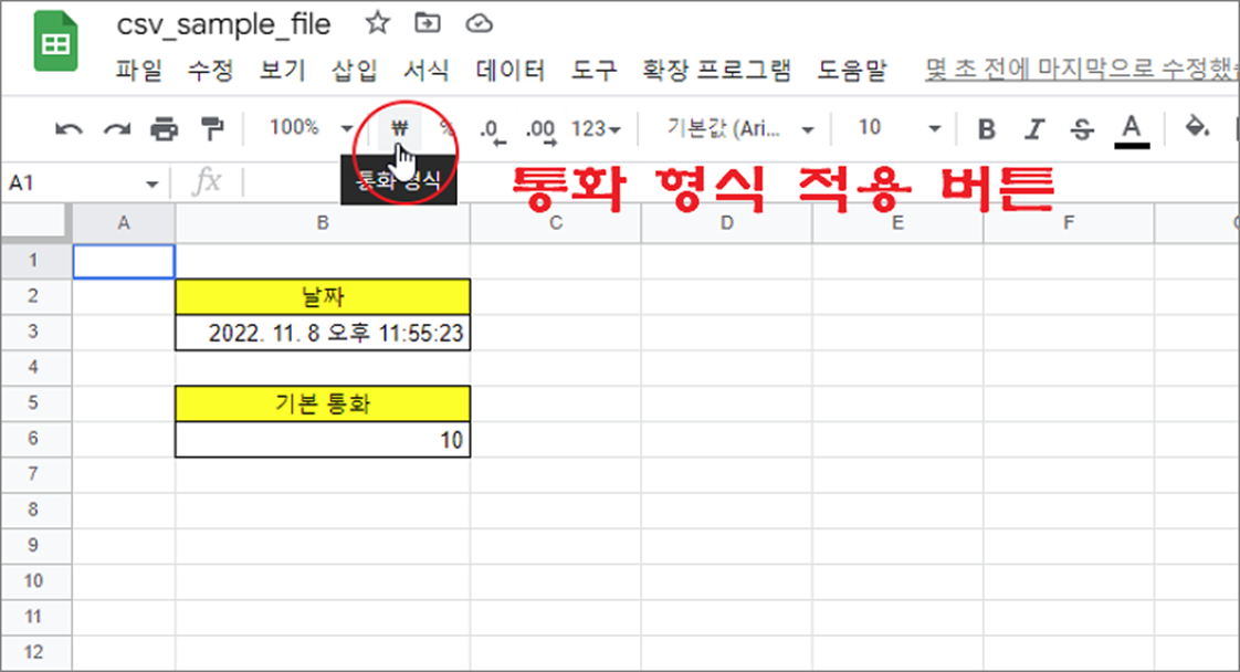 ▼ 다음은 통화 형식입니다. 현재 메뉴에는 한국 통화에 맞는 형식이 표시 되어 있습니다.