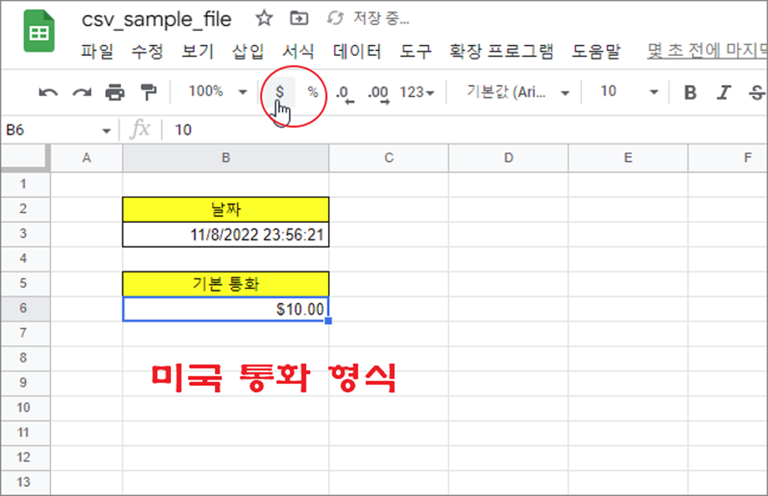 ▼ 이제 언어를 미국으로 바꿔봅니다. 통화 형식 버튼의 형태는 지역(국가) 에 따라 바뀝니다.