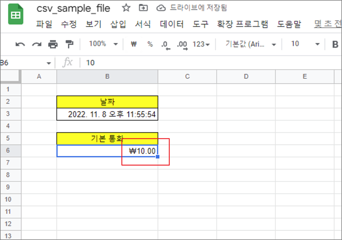 ▼ 날짜처럼 셀에 통화 형식을 적용한 결과 입니다. 숫자 앞에 “원 \” 표시가 붙었습니다.