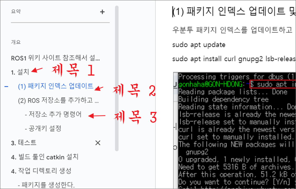 ▼ 제목 단계는 기본 3 이며, 문서에서 사용하면 다음 단계가 생성됩니다.