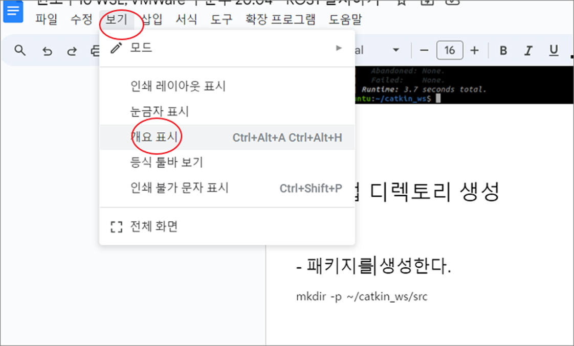 ▼ 다음은 설정한 제목을 개요 란에 표시해 보겠습니다. 왼쪽 영역에 나타나게 되는데, 추가한 제목을 모두 단계별로 볼 수 있습니다. 이것을 통해 메뉴에 해당하는 섹션으로 이동하거나 필요한 정보를 빠르게 찾을 수 있습니다. 왼쪽 개요 표시를 위해 상단 보기 > 개요 표시 메뉴를 클릭합니다.