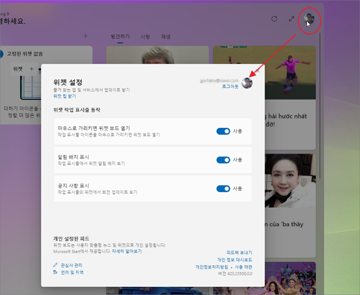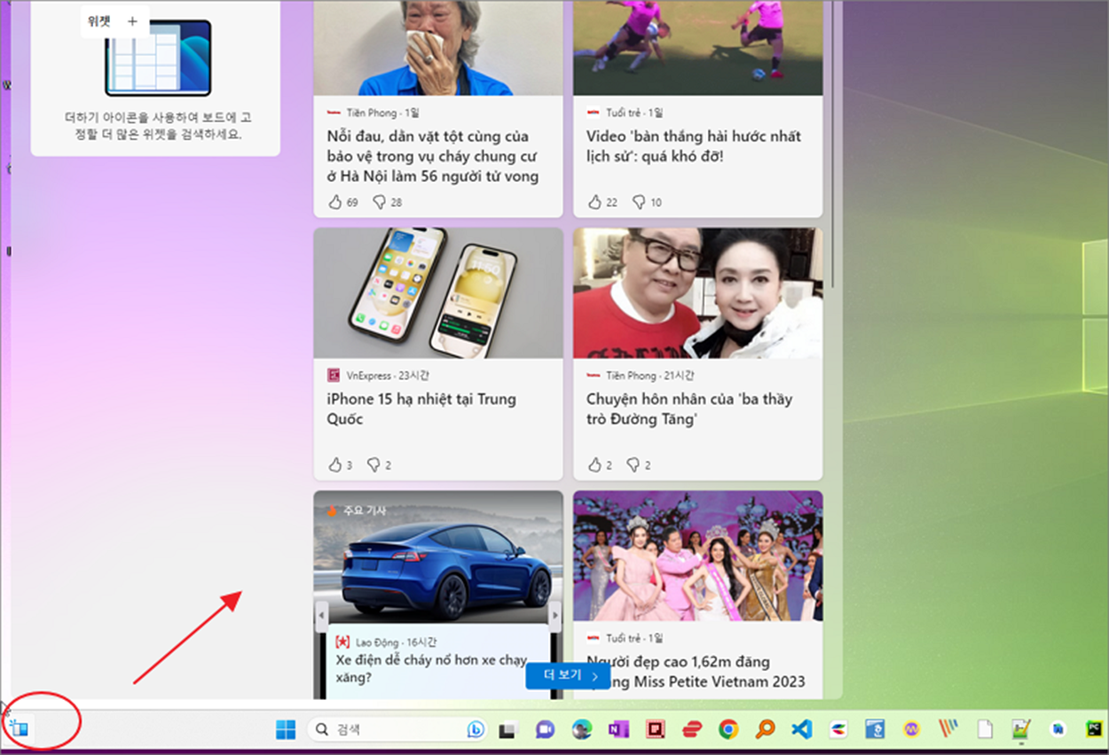 ▼ 그림처럼 윈도우 위젯에 나오는 기사가 베트남어 입니다. 이것은 해당 지역으로 설정이 되어서 그렇게 나오는 것입니다. 제가 이전에 베트남 장기 출장을 간 적 있는데, 호텔 와이파이에 접속하면서 바뀐 것으로 보입니다.