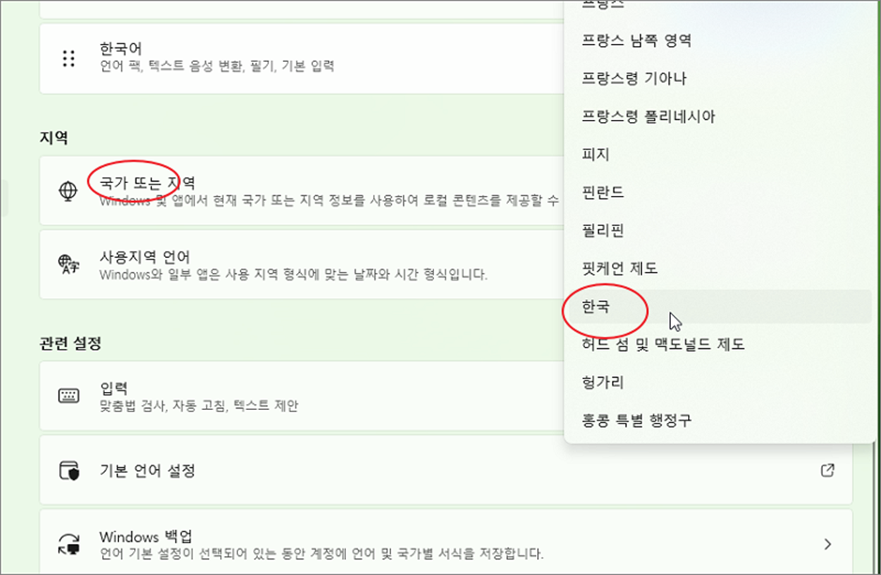 ▼ 국가 또는 지역 항목에서 베트남 -> 한국 으로 변경합니다.