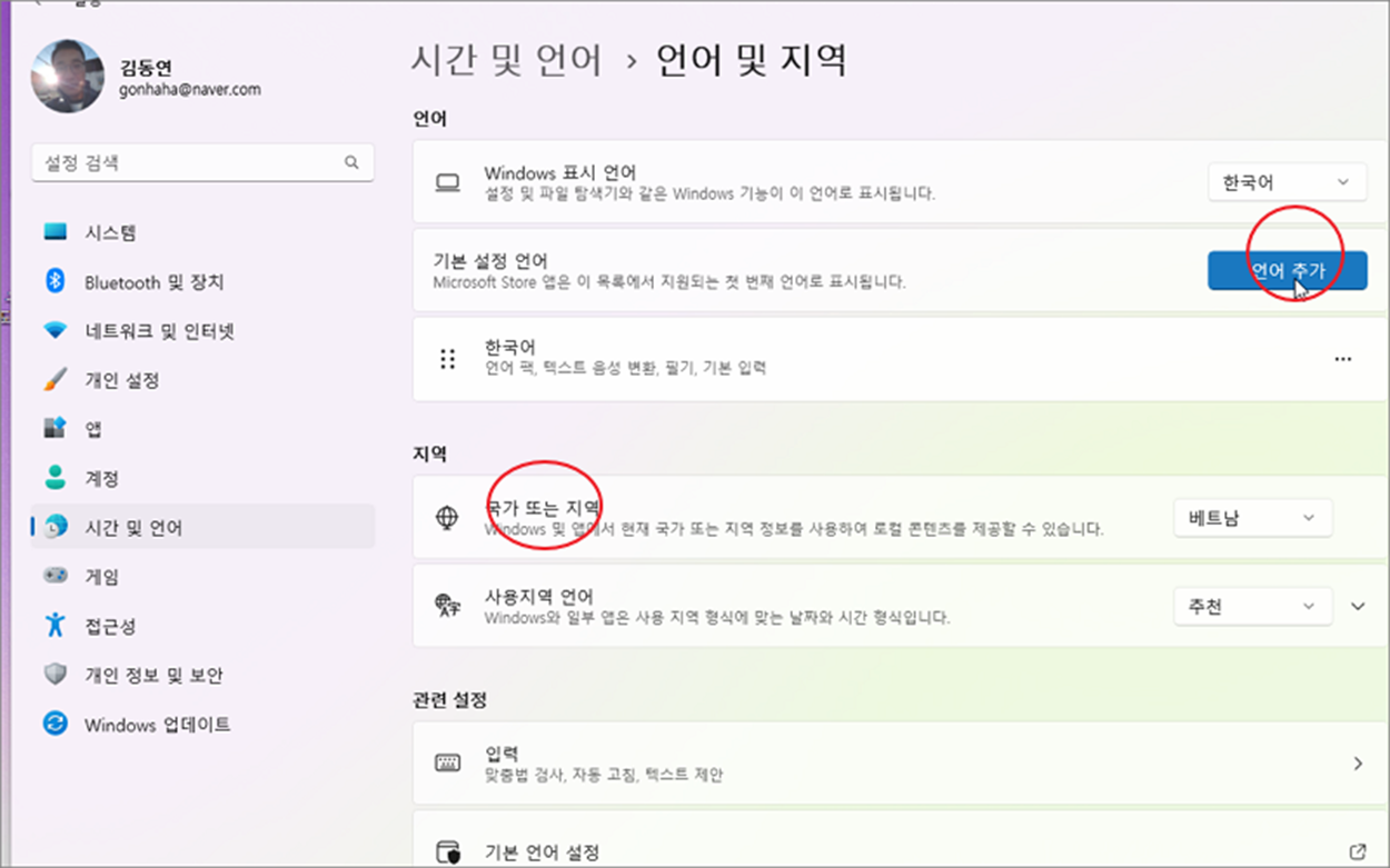 ▼ 언어 및 지역 변경 페이지로 이동하면 기본 설정 언어 란을 찾습니다. 그리고 언어 추가 버튼을 클릭해서 필요한 언어를 추가합니다. 다음 아래의 지역 > 국가 또는 지역 항목으로 갑니다.