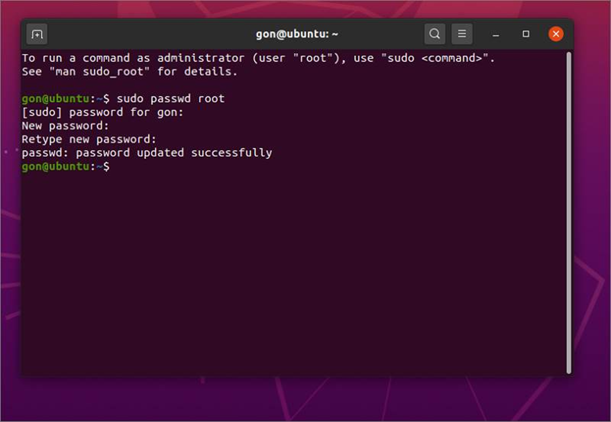 | > gon@ubuntu:~/catkin_ws$ sudo passwd root > [sudo] password for gon: > New password: > Retype new password: > passwd: password updated successfully > gon@ubuntu:~/catkin_ws$ |