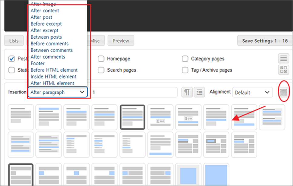 ▼ 삽입 위치는 컨텐츠, 이미지, 포스팅, 댓글 등의 앞, 뒤, 중간 등 다양합니다. 오른쪽 끝에 버튼을 클릭하면 어디에 삽입이 되는지 이미지로 확인할 수 있습니다. Insertion 의 삽입 위치 바로 옆에 숫자는 지정한 항목의 몇 번째 위치에서 표현할 것인지 정하는 옵션입니다. 예를 들어 After paragraph 인 경우 1 번째 단락 다음에 광고를 표시하라는 의미입니다.