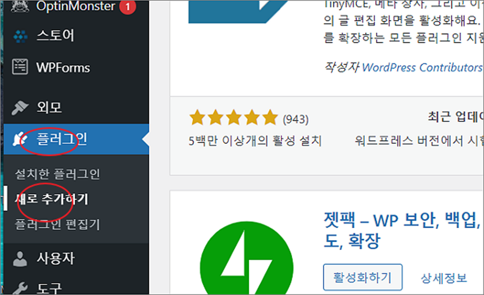 ▼ 먼저 Ad Inserter 를 설치부터 해 보겠습니다. 워드프레스 관리자 페이지로 가서 왼쪽 사이드에 플러그인 > 새로 추가하기 메뉴를 클릭합니다.