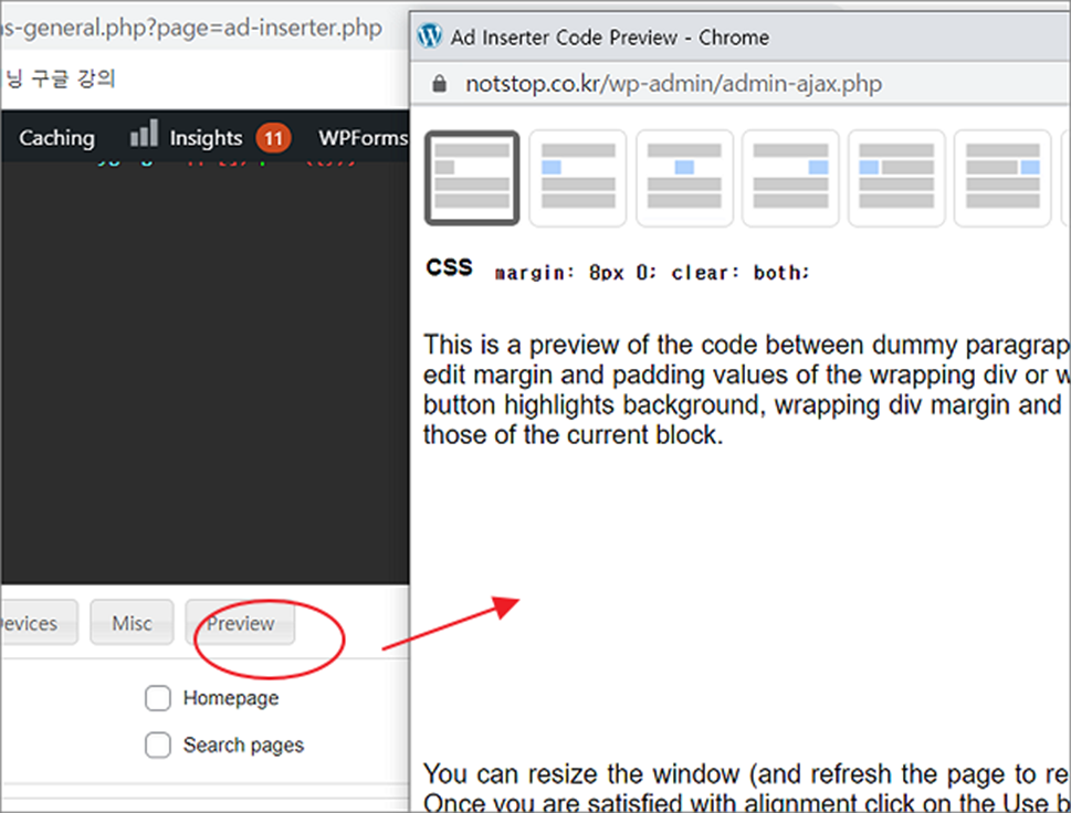 ▼ 광고의 적용 위치는 Preview 를 통해서 확인할 수 있습니다. 그런데 테마가 다양하고 디자인이 틀리기 때문에 모든 옵션이 정확하게 적용되지는 않습니다. 저도 특정 Insertion 옵션은 표현되지 않거나 의도와 다르게 나타나서 계속 테스트 중입니다.