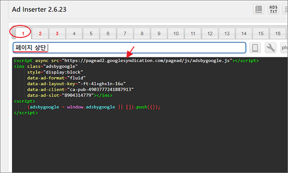 ▼ 번호를 선택하고 블록의 이름을 지정합니다. 에디터 박스에는 애드센스에서 가져온 광고 스크립트를 삽입합니다.