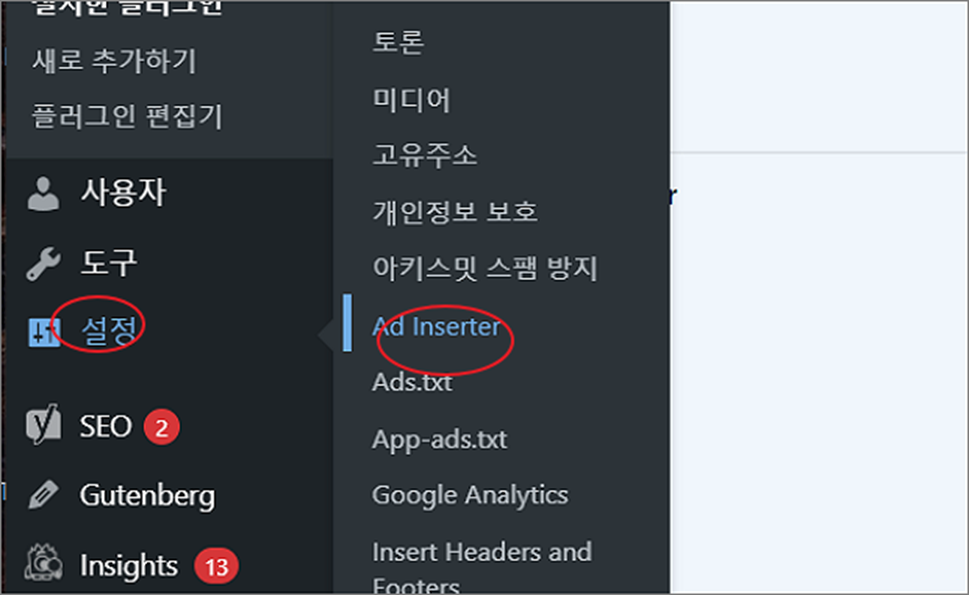 ▼ Ad Inserter 를 설치했다면 왼쪽 사이드 설정 메뉴에서 볼 수 있습니다. 설정을 위해 설정 > Ad inserter 메뉴를 클릭합니다.