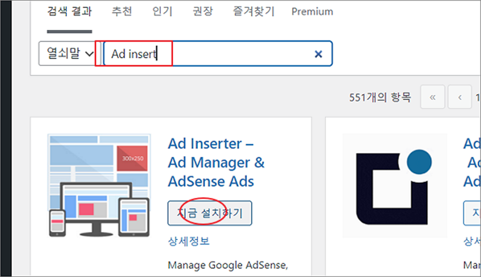 ▼ 검색으로 플러그인을 찾습니다. Ad Inserter 를 찾아 설치하고 활성화 합니다.