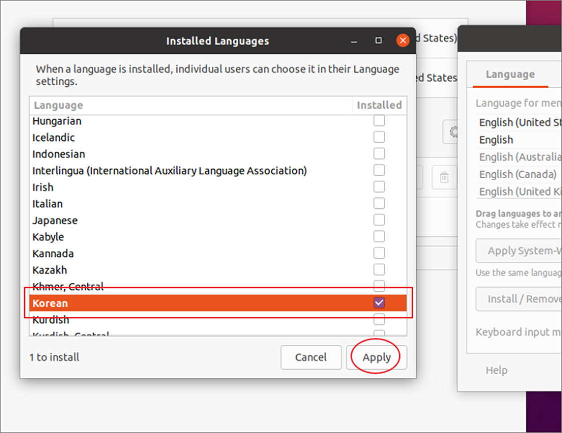 ▼ Installed Languages 팝업창의 언어 목록에서 Korea 를 찾습니다. 그리고 오른쪽 끝 Installed 옵션에 체크합니다. 팝업창 하단에 Apply 버튼을 눌러 설치를 진행합니다.