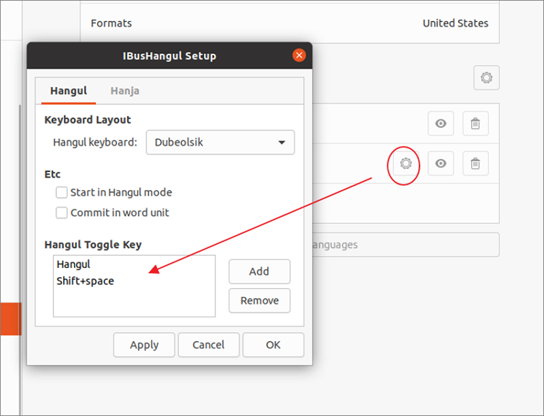 ▼ 톱니바퀴를 클릭하면 한글 전환 단축키를 볼 수 있습니다. 화면에는 Shift + Space 로 되어 있습니다.