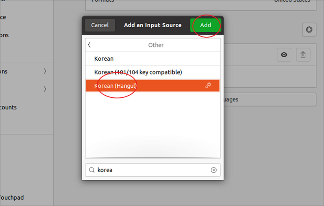 ▼ other 목록에 Korea(Hangul) 을 찾아 선택하고 오른쪽 상단 Add 버튼을 눌러 추가합니다.
