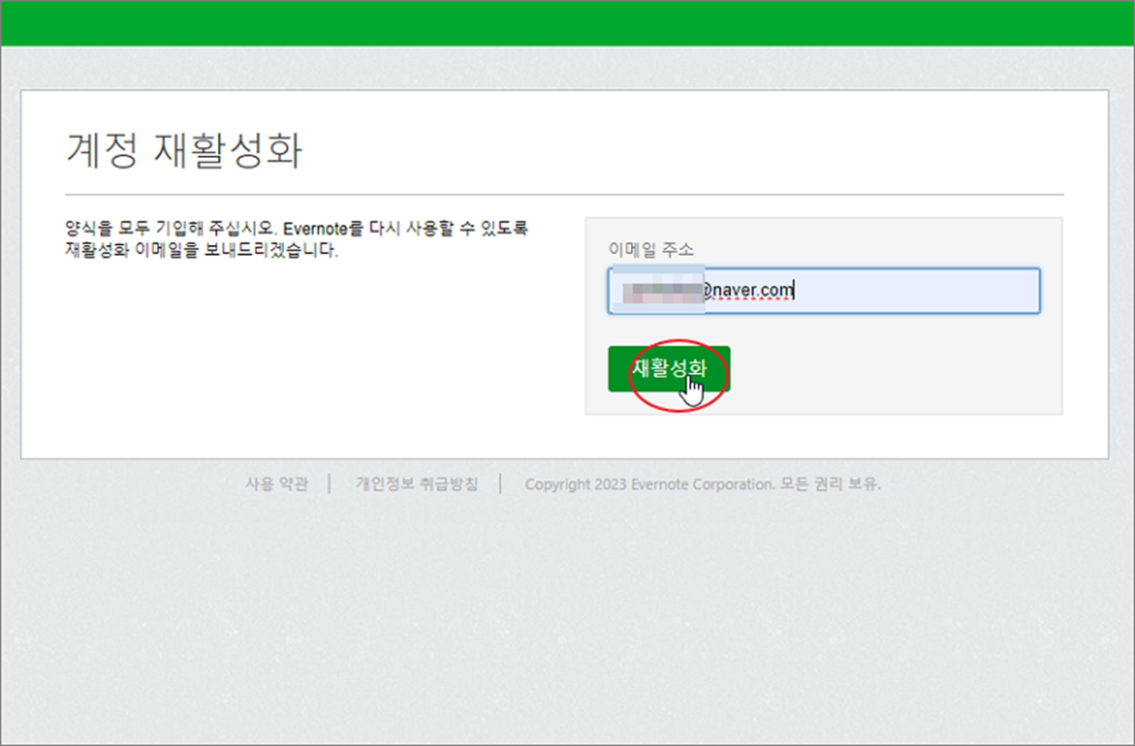 ▼ 이제 에버노트에서 보낸 메일을 확인해야 합니다. 계정 메일 주소로 가서 에버노트에서 보낸 내용을 보시면 “내 계정 재활성화” 버튼을 볼 수 있습니다.