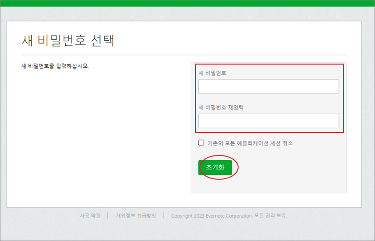 ▼ 다시 에버노트 재활성화 페이지로 이동하면 새로운 비밀번호를 묻습니다. 새 비밀번호를 입력하고 초기화 버튼을 클릭합니다.