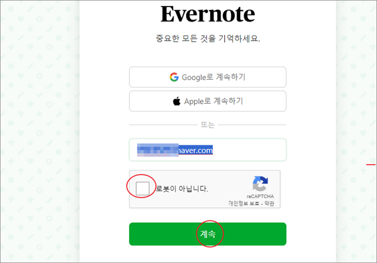 ▼ 에버노트 사이트에 접속한 후 로그인 페이지로 이동합니다. 로그인 페이지에서 계정을 입력하고 “로봇이 아닙니다.” 를 체크하고 “계속” 버튼을 클릭합니다.