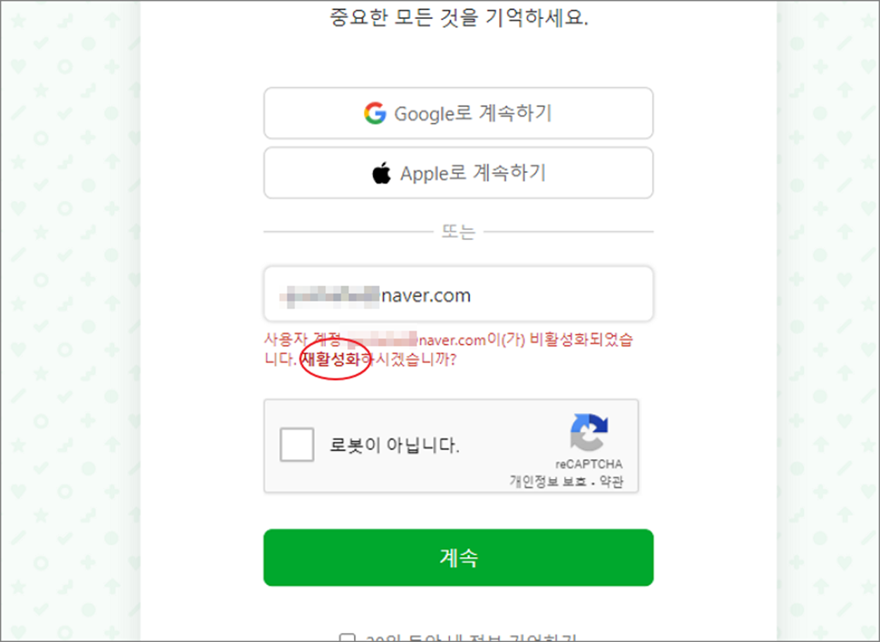 ▼ 계정 입력란 바로 아래에 재활성화 할 것인지 문구가 나타납니다. 여기에서 “재활성화” 문구가 볼드 처리되어 있습니다. 여기에 웹 사이트 링크가 걸려 있습니다.