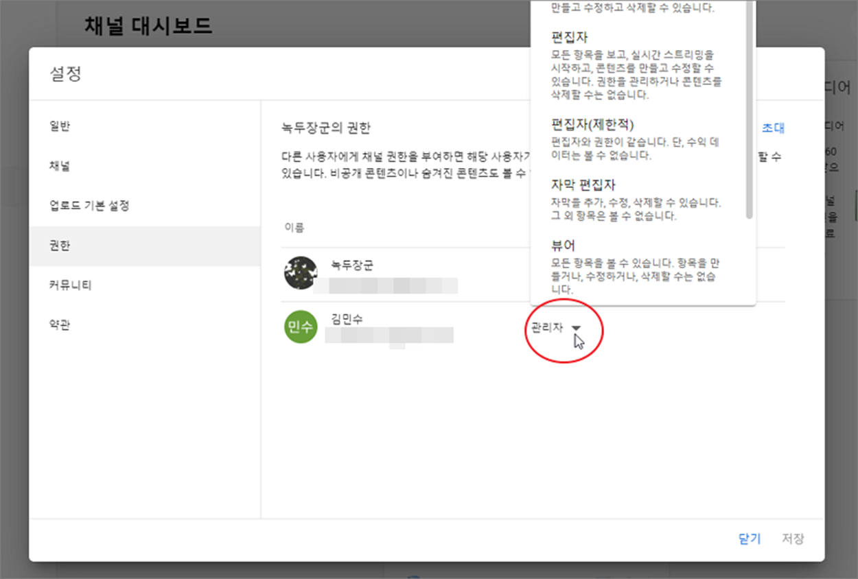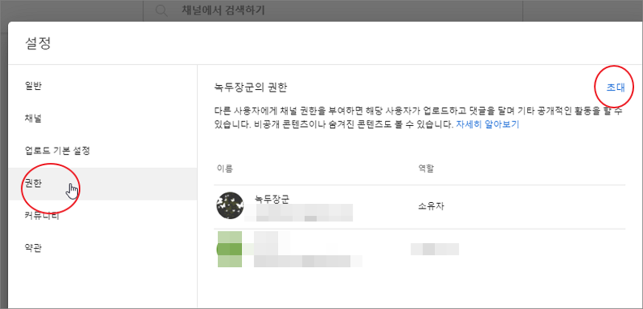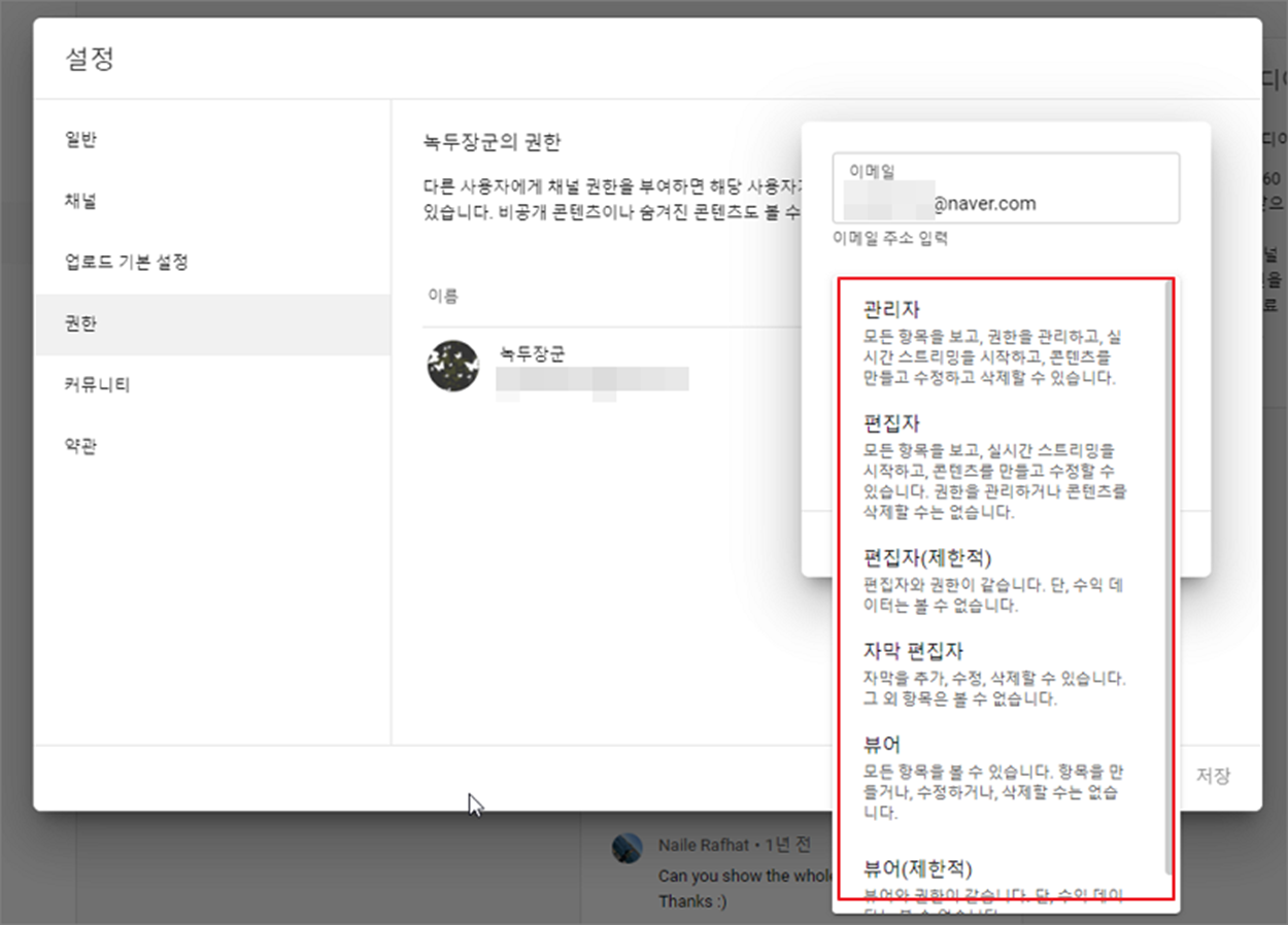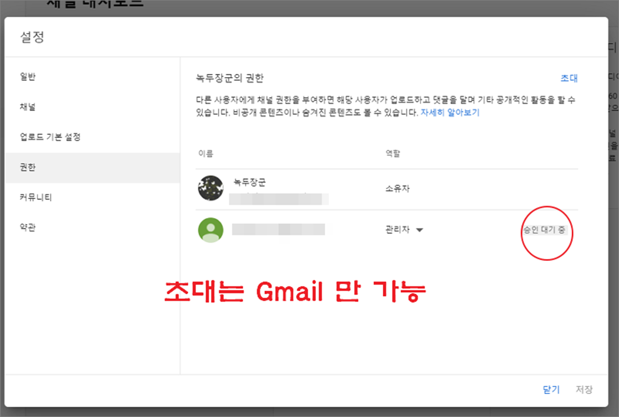 ▼ “초대” 창에는 공동 편집자의 메일 주소와 유튜브 스튜디오에서 영상과 관련한 권한을 지정합니다. 위에서 언급했듯이 이메일은 구글 메일 계정으로 해야 합니다.