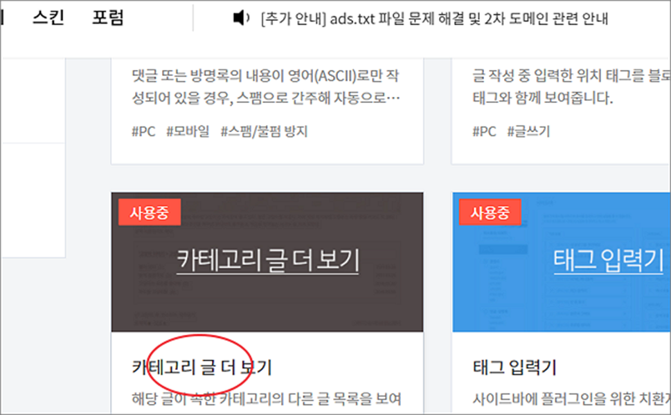 ▼ 플러그인 목록에서 카테고리 글 더 보기 를 찾습니다. 현재 “사용중” 으로 되어 있습니다. 카테고리 글 더 보기 타이틀을 클릭해서 상세 페이지로 이동합니다.