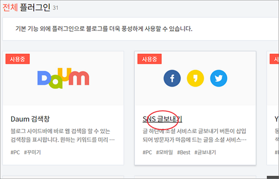 ▼ 플러그인 목록에서 SNS 글 보내기 를 찾아 클릭합니다.