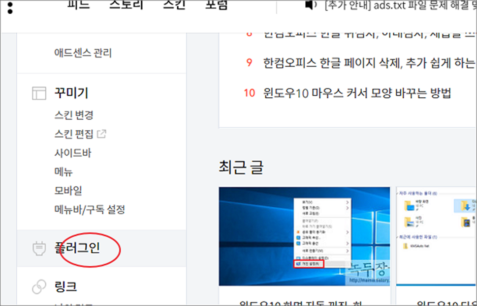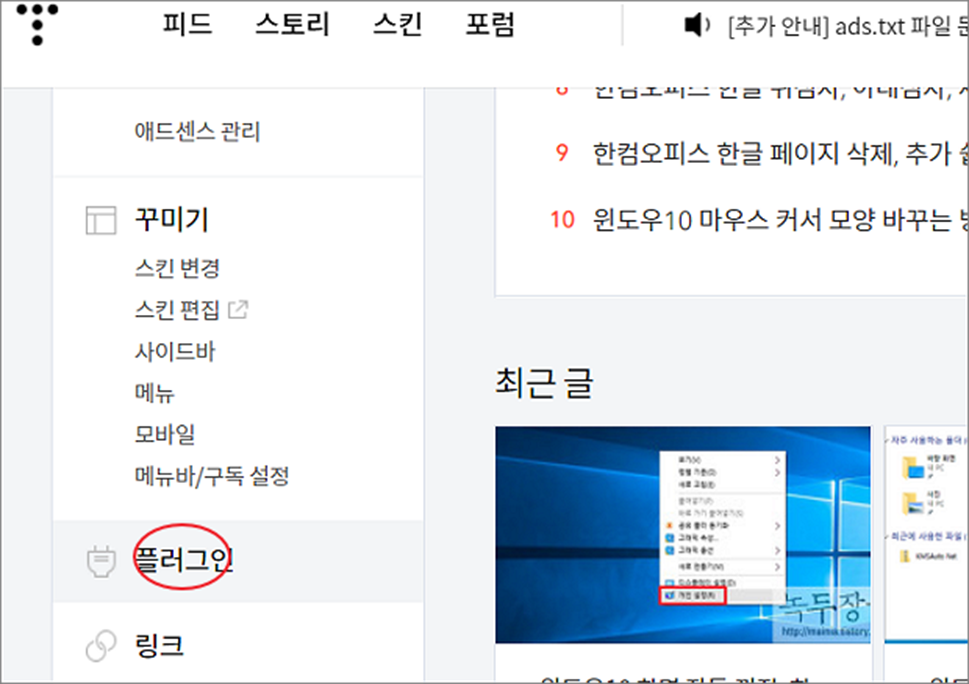 ▼ 티스토리 관리자 화면으로 가서 플러그인 메뉴를 클릭합니다.