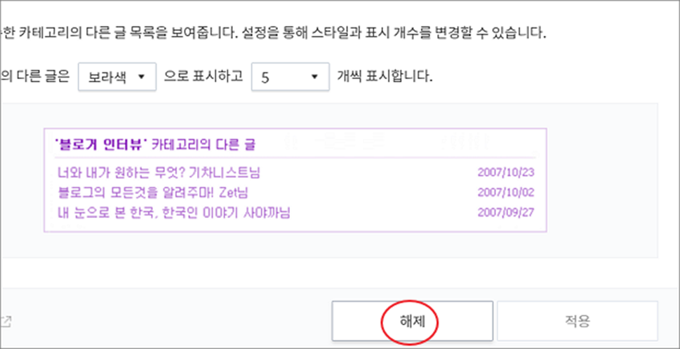 ▼ 카테고리 상세 화면에서 화면 하단 해제 버튼을 눌러 사용을 중지합니다.