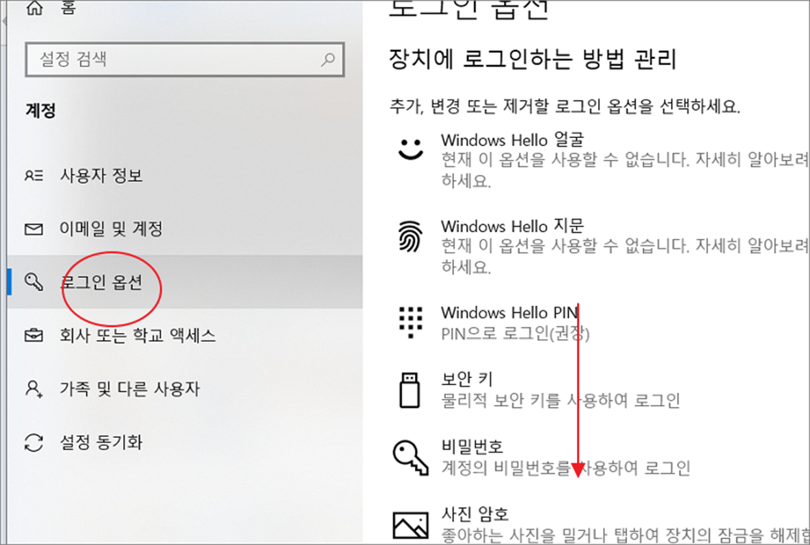 ▼ 다음 “계정” 설정 화면 왼쪽 사이드에 “로그인 옵션” 을 선택합니다. 오른쪽 화면으로 이동해서 아래로 내려갑니다.