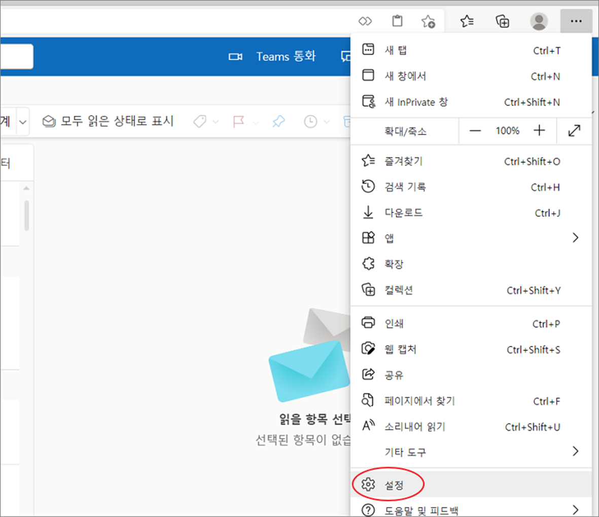 ▼ 세 번째로 익스플로러에서 엣지로 전환하는 옵션을 끄는 방법입니다. 엣지 브라우저를 열어서 설정 화면으로 이동합니다.