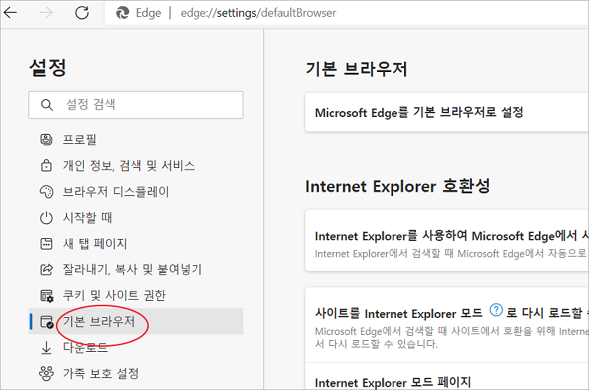 ▼ 설정 화면 왼쪽 사이드에 기본 브라우저 메뉴를 선택합니다.