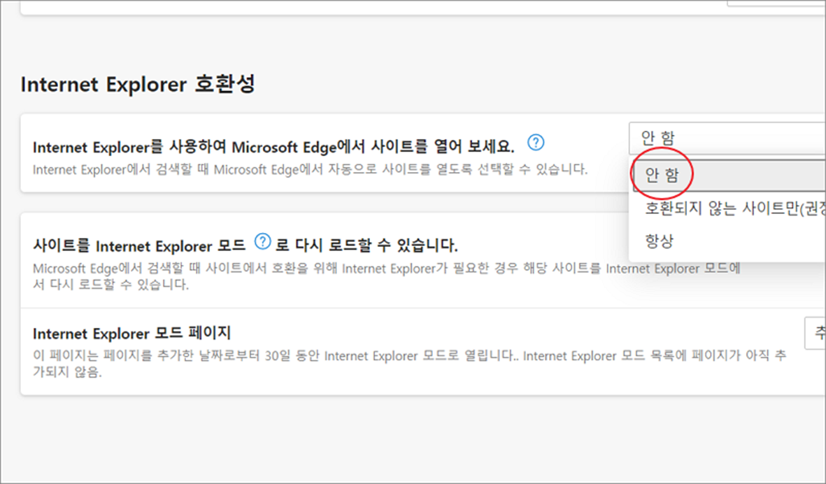 ▼ 기본 브라우저 설정에서 “Internet Explorer 호환성” 항목을 찾아 이동합니다. 그리고 “Internet Explorer 를 사용하여 Microsoft Edge 에서 사이트를 열어 보세요. “ 설정을 “안 함” 으로 변경합니다.